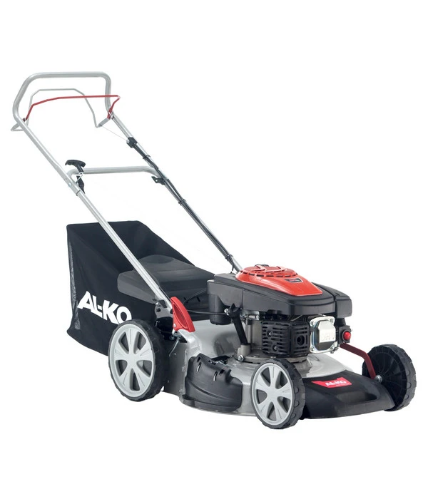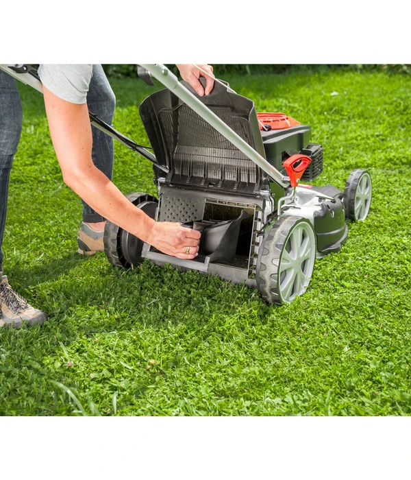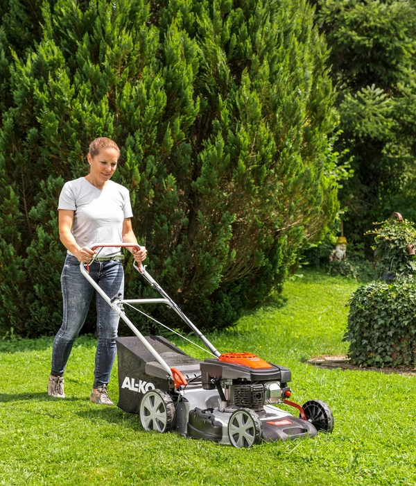 Wenn Sie für die Pflege Ihres Rasens das passende technische Equipment suchen, treffen Sie mit dem AL-KO Benzinrasenmäher Easy 5.10 SP-S eine sehr gute Wahl. Dank eines aerodynamischen Gehäuses überzeugt das Gartengerät mit optimalen Mäh- und Fangeigenschaften. Ein Hinterradantrieb mit Kugellagern trägt zur Wendigkeit des Modells bei und ermöglicht Ihnen ein kraftsparendes Arbeiten. Zudem bietet Ihnen das qualitätsvolle Zubehör vier unterschiedliche Funktionen, aus denen Sie bedarfsgerecht Ihren jeweiligen Anforderungen entsprechend wählen können: Neben dem Mähen stehen Ihnen Optionen für das seitliche Auswerfen des gemähten Grases, das Mulchen oder das Auffangen des Rasenschnitts zur Verfügung. Der Rasenschnitt wird in einer extra großen Gewebefangbox, welche Sie platzsparend lagern können, gesammelt. Mit dem AL-KO Benzinrasenmäher Easy 5.10 SP-S sind Sie bestens ausgestattet!