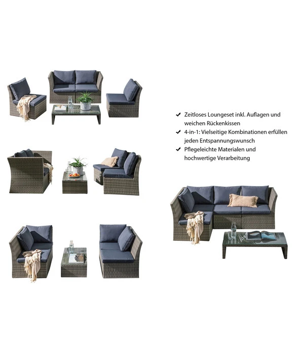 Möchten Sie Ihren Außenbereich optisch aufwerten und suchen für Ihre Terrasse noch zeitlose Lounge-Möbel, die perfekt aufeinander abgestimmt sind? Dann entscheiden Sie sich doch für die Dehner Geflecht-Lounge Rom, die aus einer Bank, zwei Stühlen, einem Tisch sowie bequemen Kissen besteht und Platz für bis zu vier Personen bietet. Die elegante Geflecht-Lounge verwandelt Ihre Terrasse im Handumdrehen in eine Wohlfühloase und ist darüber hinaus ein echter Hingucker. Verbringen Sie entspannte Stunden mit Freunden oder der Familie auf dieser bequemen Lounge und profitieren Sie vom Komfort der dicken Auflagen und der weichen Rückenkissen.