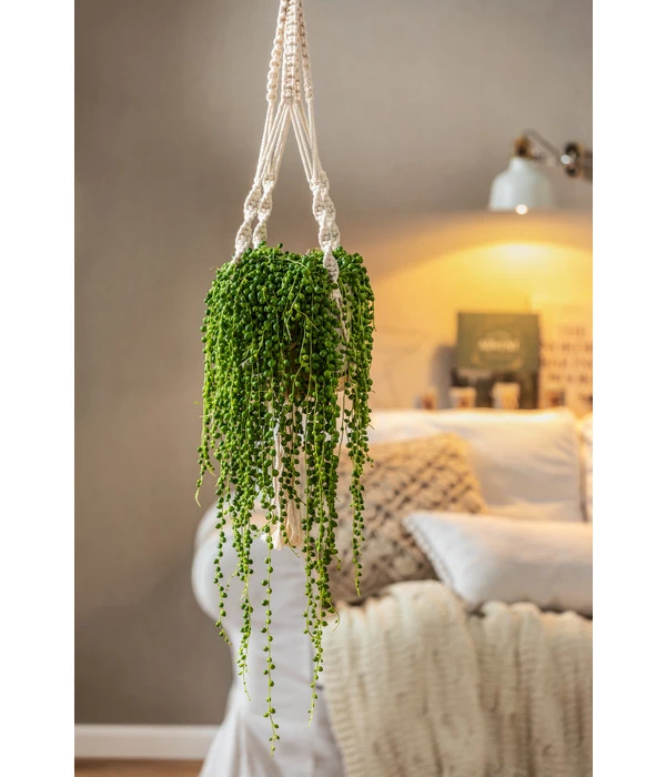 Sie sind ein Fan des angesagten Bohemian-Styles? Diesem Wohnstil, der fast schon ein Lebensstil ist und perfekt für alle Individualisten ist, die sich in keine Schublade sperren lassen wollen? Dann können wir Ihnen hier mit der Ampel aus Makramee das trendige i-Tüpfelchen anbieten. Es handelt sich dabei um eine Pflanzenampel, die ausschließlich aus einem robusten Textil-Material besteht, die locker eine Pflanze mit Übertopf halten kann. Und dieses Textilmaterial wurde ganz im traditionellen Makramee-Stil kunstvoll von Hand geknüpft. Zaubern Sie jetzt entspanntes Boho-Feeling in Ihre Räume – mit der Makramee-Ampel! Noch ein Tipp: Mit einem gehäkelten Kissen, einem geknüpften Teppich und einem Korbstuhl in Flechtoptik wird der trendige Look perfekt.