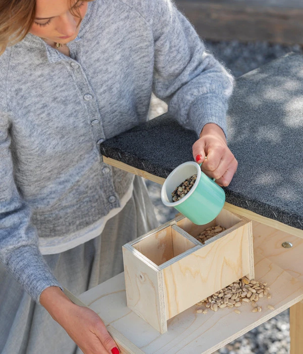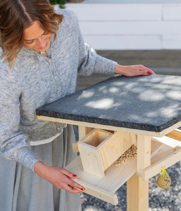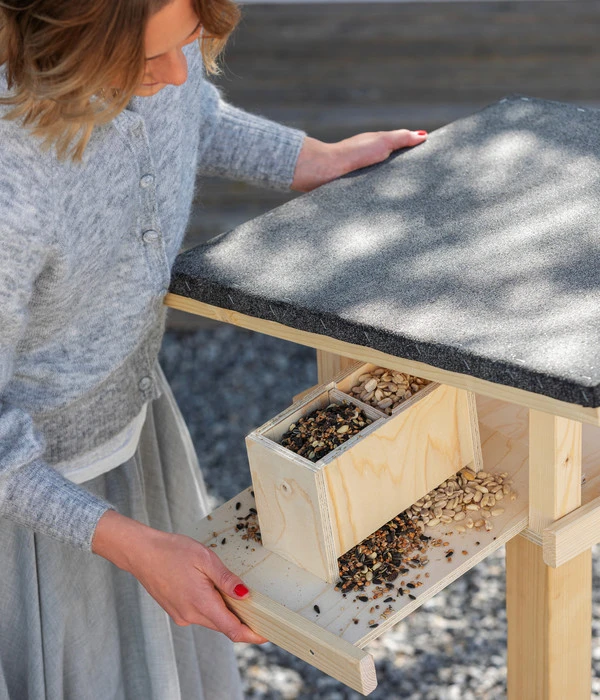 Das Futterhaus Rofan inkl. Ständer von Dehner Natura bietet die perfekte Lösung für alle Vogelfreunde. Sein Design ist nicht nur sehr ansprechend, sondern auch durchdacht. Das Futterhaus Rofan besitzt eine ausziehbare Futterlade mit herausnehmbarer Trennwand. So kann der Behälter bequem mit unterschiedlichem Streufutter befüllt werden. Eine Erhebung sorgt für das automatische Nachrutschen der Körner. Zusätzlich gibt es an der Seite noch vier Haken für Meisenknödel, Futterstangen, etc. Die Lade kann zur bequemen Reinigung auch komplett herausgenommen werde. Unbedingt zu erwähnen ist auch das durchgängige, verzinkte Blechpultdach, das die Futterstelle großzügig abdeckt und vor Regen und Schnee schützt.