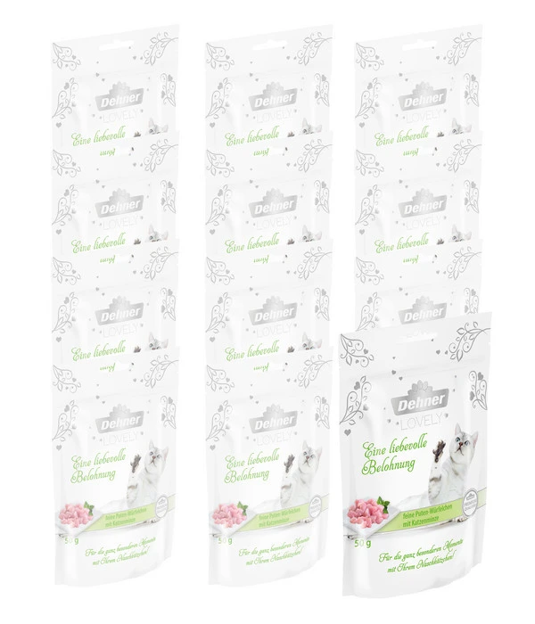 Da der Dehner Premium Lovely Katzensnack Eine liebevolle Belohnung bestimmt vom ersten Moment an zu den Lieblingsleckerlis Ihrer Katze gehören wird, sollten Sie immer eine ausreichende Menge davon im Haus haben. Deshalb bieten wir Ihnen jetzt den Snack im praktischen Vorratspack mit 12 x 50 g an. Und natürlich sparen Sie dabei auch noch bares Geld.