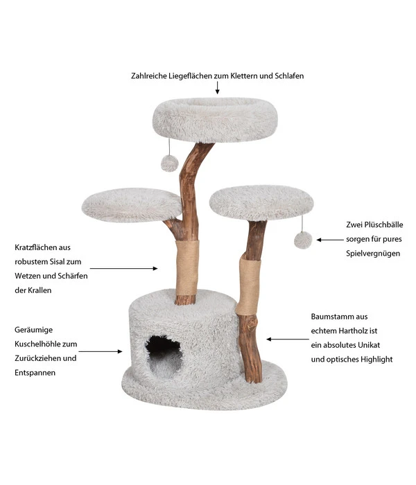 Der Natur-Kratzbaum Aufsteigen & Abschalten von Dehner Premium Lovely hat neben den Liegeflächen auch zwei Abschnitte, die mit kräftigem, echtem Sisal umwickelt sind. Das heißt: Dort kann sich Ihre Samtpfote ausgiebig ihrer Krallenpflege hingeben und muss dieses natürliche Bedürfnis nicht an Ihren Möbeln oder Teppichen ausleben. Und die zwei Spielbälle laden natürlich zum Fangenspielen ein.