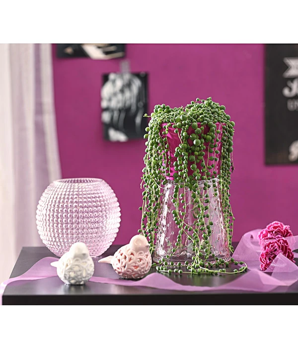 Natürlich ist die Erbsenpflanze auch solo ein toller Blickfang, vor allem, wenn Sie ihn entsprechend stilvoll arrangieren und die grünen Perlenschnüre sich aus Ampeln oder hohen Vasen ergießen. Möchten Sie eine kleine exotische Oase in Ihren vier Wänden inszenieren, kombinieren Sie die Erbsenpflanze mit anderen Sukkulenten wie verschiedenen Echeverien und bizarren Haworthien und ergänzen das Arrangement mit Accessoires wie rustikalen Pflanzenwurzeln und Steinen.