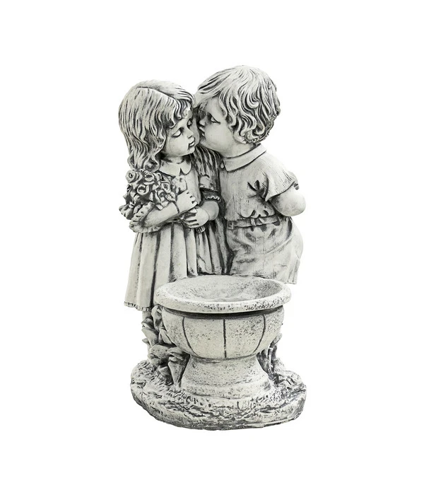 Bei Betrachtung der süßen fantasieco Stein-Kinder mit Pflanztrog fällt sofort die filigrane Gestaltung auf. Mit viel Liebe zum Detail wurden charakteristische Merkmale wie Gesichter und Kleidung herausgearbeitet. Die Zuneigung des Jungen zu dem Mädchen ist deutlich zu erkennen. Er gibt ihr einen Kuss und hat ihr sicherlich den Strauß Rosen mitgebracht, den sie in den Armen hält. Platzieren Sie nun noch eine schöne Pflanze in dem hübschen Gefäß vor den beiden, ergibt das Gesamtbild ein wunderbar romantisches Szenario. Erfreuen Sie sich jederzeit an ihren fantasieco Stein-Kindern mit Pflanztrog, wenn Sie eine entspannte Zeit in Ihrem Garten genießen.