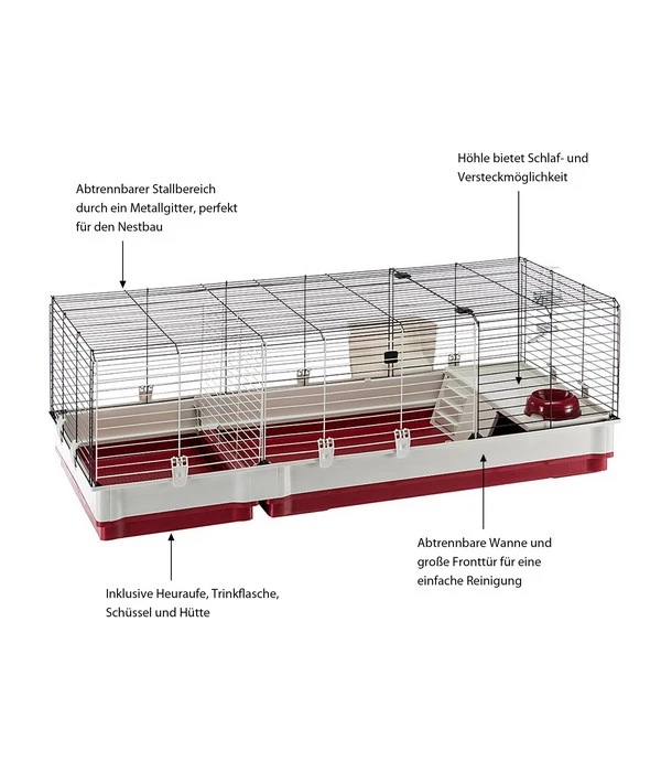 Ganz egal, ob Sie sich einen Fellfreund für Ihren Single-Haushalt wünschen oder Ihren Kindern den lang ersehnten Wunsch vom eigenen Haustier erfüllen möchten – mit dem ferplast Nagerheim Krolik holen Sie sich ein überzeugendes Basispaket für die Nagerhaltung nach Hause. Nicht nur Kaninchen nehmen diesen komfortablen Rückzugsort dankbar an, sondern zum Beispiel auch Meerschweinchen. Integrieren Sie das Nagerheim Krolik in einen Freilaufbereich oder nutzen Sie es als Übernachtungsmöglichkeit. Sie versuchen sich in der kontrollierten Kleintierzucht? Das Nagerhaus ist dank des mittels eines Trenngitters abtrennbaren Stallbereiches auch perfekt für den Nestbau geeignet.