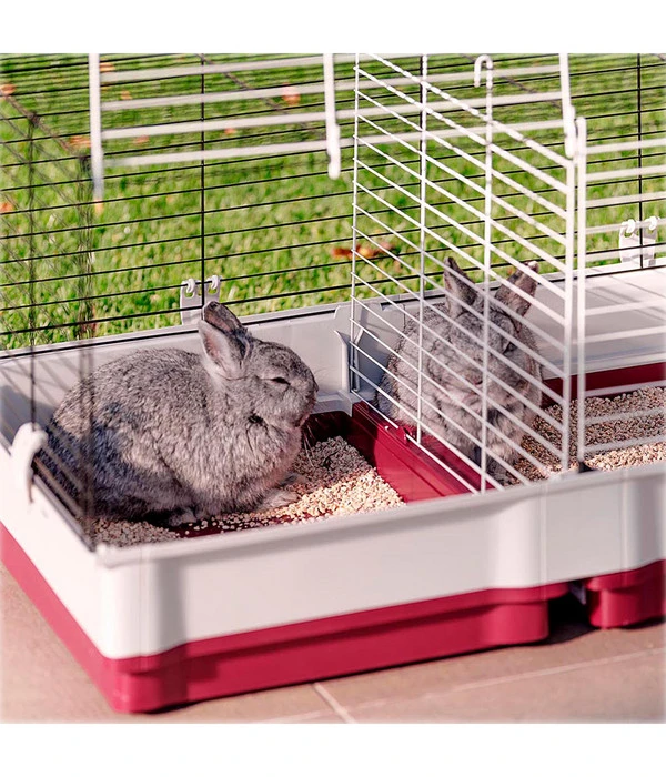 Die praktische Kombination aus Harz-Unterschale und stabilem lackiertem Metallgitter macht das Krolik Nagerheim zu einer idealen Lösung in jeder Situation. Die Konstruktion ist vollständig zerlegbar und beansprucht wenig Platz beim Transport. Es wird Sie sicher freuen zu hören, dass sich auch die Reinigung des Nagerheims sehr einfach und komfortabel gestaltet, denn dank der großen Fronttür sind alle Bereiche des Käfigs hervorragend erreichbar. Ihr ferplast Nagerheim Krolik wird inklusive Heuraufe, Trinkflasche, Schüssel und Hütte geliefert. Greifen Sie jetzt zu!