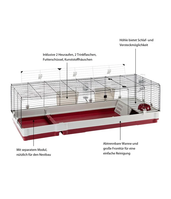 Sie spielen mit dem Gedanken, Kaninchen oder Meerschweinchen ein Zuhause zu geben? Vielleicht möchten Sie auch Ihren Jüngsten den sehnlichen Wunsch nach einem putzigen Nager als Haustier erfüllen? Das ferplast Nagerheim Krolik 160 cm bietet die perfekte Erstausstattung für die tierfreundliche Nagerhaltung. Der Käfig ist leicht und auch für den Transport Ihrer Tiere geeignet. Bieten Sie Ihren kleinen Fellfreunden maximalen Komfort und integrieren Sie Ihr Nagerheim Krolik in einen großzügigen Freilaufbereich. So haben Ihre Tiere einen gemütlichen Rückzugsort zum Ruhen und Übernachten.