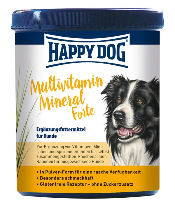 Sie lieben es, nicht nur für sich und ihre Familie gesund und abwechslungsreich zu kochen, sondern stellen auch Ihrem treuen Freund leckere Mahlzeiten aus Fleisch, Gemüse, Öl und vielleicht Reis, Kartoffel und Co zusammen? Mahlzeiten, die Ihr Vierbeiner mit erkennbarem Genuss futtert und die ihm auch ausgezeichnet bekommen? Und doch sind Sie sich nicht ganz sicher, ob Sie Ihrem Schatz alle erforderlichen Nährstoffe in ausreichendem Maß zur Verfügung stellen? Diese Sorge ist durchaus berechtigt, denn eine gut ausbalancierte Ergänzung mit ausreichend Mineralien, Vitaminen und Spurenelementen ist für die langfristige Gesundheit Ihres Vierbeiners dringend erforderlich. Aus genau diesen Gründen wurde das Happy Dog Ergänzungsfutter Multivitamin Mineral Forte entwickelt. Geben Sie Ihrem Schatz täglich seinen Gesund-Booster: das Happy Dog Ergänzungsfutter Multivitamin Mineral Forte!