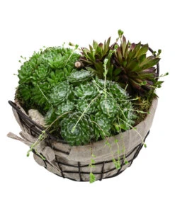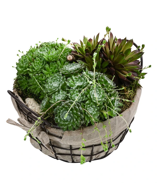 Hauswurz-Arrangement Landhaus Garten, In Metall-Korb