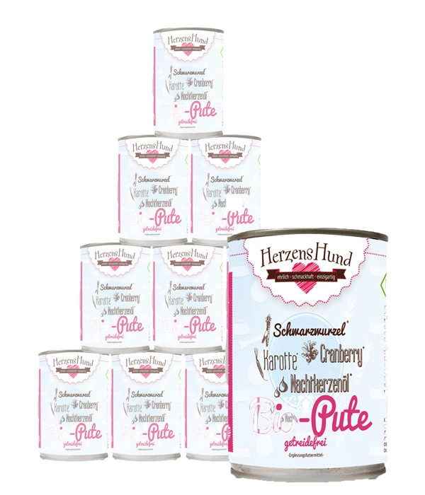 Wie es Ihr Hund liebt, beinhaltet das HerzensHund Ergänzungsfutter Bio-Pute mit Bio-Karotte aus 60 % Putenfleisch, davon 80 % Brustfleisch, 5 % Herz, 5 % Hälse, 5 % Karkasse und 5 % Leber. Das Putenfleisch stammt aus artgerechter Tierhaltung und weil jedes Menü schonend verarbeitet wurde, konnten auch alle wesentlichen Nährstoffe, Mineralien und Vitamine in ihrer natürlichen Form weitgehend erhalten bleiben. Ergänzt wird das Putenfleisch durch frisch verarbeitete Karotten, vitaminreiche Bio-Cranberrys und Bio-Nachtkerzenöl, das viele essentielle Fettsäuren enthält, die positive Effekte auf Haut und Fell Ihres Lieblings haben.