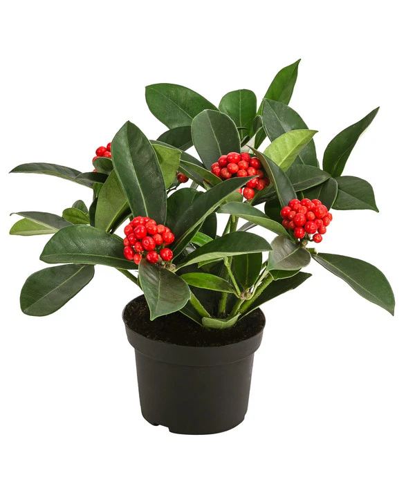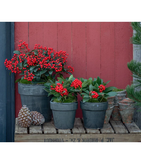 Was alle Topf-Gärtner freuen wird: Die Skimmie nimmt auch gerne in einem Kübel Platz und schmückt so ganzjährig Terrassen, Balkone und Hauseingänge. Haben Sie einen kühlen Hausflur – nicht wärmer als 15 °C – wird die Japanische Frucht-Skimmie ‘Temptation‘ auch dort zur Winterzeit ihren prachtvollen Beerenschmuck zur Schau stellen. Die knallroten Beerenbüschel setzen aber auch dekorative Farbakzente in Gestecken und Kränzen.