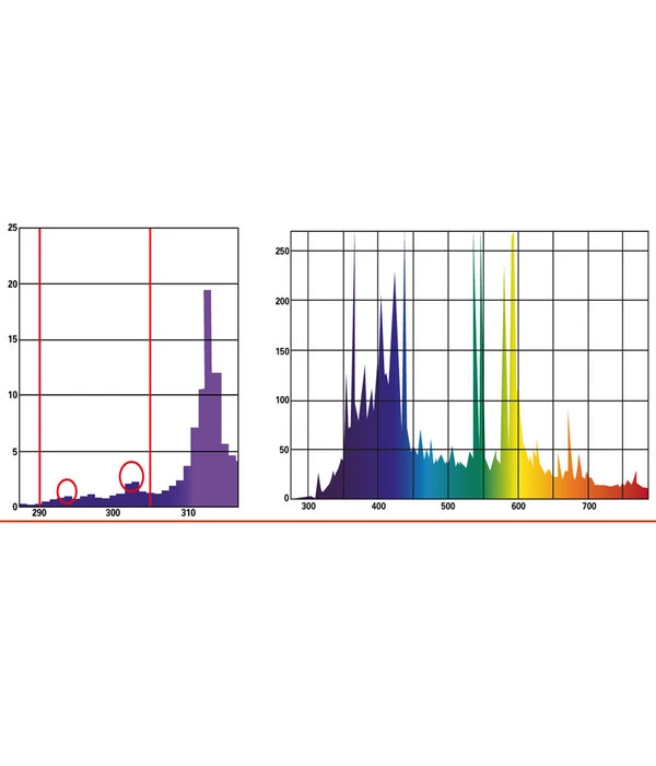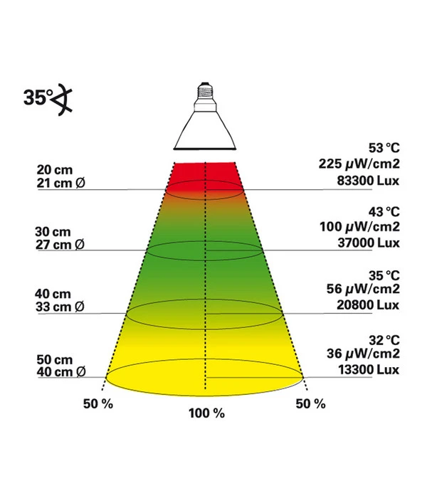 Eine hohe Lichtintensität ist vor allem für das Wohlbefinden, die Aktivität und für die Färbung von Wüstenbewohnern äußerst wichtig. In der Natur sind Lichtintensitäten von 100.000 Lux und mehr nichts ungewöhnliches, daher war es bisher nicht möglich die Lichtbedingungen der Wüste im Terrarium nachzustellen. Außerdem wurde das Spektrum der Lucky Reptile Bright Sun UV Desert speziell auf die Bedürfnisse von Wüstenreptilien abgestimmt. Bei verschiedenen Versuchsreihen stellte man fest, dass Reptilien aus Wüstenregionen ein Tageslichtspektrum mit einer Farbtemperatur von 6000 K bevorzugen. Genau dieser Wert wird von der Lucky Reptile Bright Sun UV Desert schnell und einfach erreicht. Die Wärme, die UV-Strahlung und die hohe Beleuchtungsstärke der Lucky Reptile Bright Sun UV Desert schafft sozusagen eine Mini-Sonne in Ihrem Reptilienheim. Die Lucky Reptile Bright Sun UV Desert verfügt zudem über eine besonders hohe Energieeffizienz, denn der Großteil der eingesetzten Energie wird in Licht umgewandelt. Im Vergleich dazu: Bei Glühfadenlampen werden 95 % der Energie in Wärme konvertiert. Da die Abwärme der Lampe so geringe ist, kann die Lucky Reptile Bright Sun UV Desert auch problemlos in kleinere Terrarien eingesetzt werden. Ein weiteres Highlight der Lucky Reptile Bright Sun UV Desert ist, dass fast die komplette Wärme in einem Lichtfokus konzentriert wird. Somit können Sie schnell und einfach Sonnenplätze in Ihrem Terrarium schaffen, das wirkt sich wiederrum positiv auf das Wohlbefinden Ihrer Tiere aus. Die Lucky Reptile Bright Sun UV Desert hat eine Lebenserwartung von ca. 6.000 Stunden. Es wird trotzdem empfohlen, die Metalldampflampe mindestens einmal im Jahr auszutauschen, da das Spektrum sich technologisch bedingt nach gewisser Zeit verändert und auch die UV-Strahlung sowie die Lichtleistung im Allgemeinen mit der Zeit nachlassen. Die Lucky Reptile Bright Sun UV Desert passt in E27 Porzellanfassungen, trotzdem wird für den Betrieb ein Vorschaltgerät benötigt.