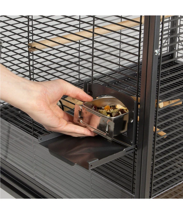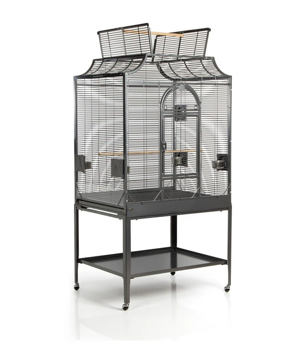Auch Vögel mögen ein schickes Zuhause haben. Mit der Vogelvoliere Madeira III Antik erhalten Sie einen besonders edlen Vogelkäfig, der Ihren gefiederten Lieblingen zudem noch besonders viel Platz bietet. Er besteht aus schwermetallfreiem Stahl, überzogen mit einer Avilon Pulverbeschichtung, welche speziell für die Vogel- & Nagerhaltung ausgelegt ist. Die Vogelvoliere Madeira III Antik überzeugt vor allem durch ihre filigrane, waagrechte Verdrahtung. Die Vogelvoliere Madeira III Antik eignet sich optimal als Grund- bzw. Erstausstattung, da Sie viele nützliche Extras dazu erhalten. Neben den vier Außentüren und einer Zusatztür, welche zur Anbringung eines Nistkastens oder Badehauses geeignet sind, bekommen Sie vier Edelstahlnäpchen und zum Spritzschutz Klarsicht-Acrylscheiben. Der supergroße Vogelkäfig verfügt zudem über eine kleine Anflugklappe oberhalb der großzügigen Haupttür, welche die perfekte Ausstattung komplett macht. Aber auch die Reinigung der Vogelvoliere sollte man ansprechen, da diese mehr als kinderleicht fällt. Dank eines Kotgitters sowie Schublade, die zudem über eine Metallklappe gesichert werden, können Sie den Käfig schnell und einfach säubern und Ihren gefiederten Lieblingen ein prächtiges Zuhause bieten. Für eine leichtere Positionierung verfügt die Voliere über einem Rollwagen inkl. Ablage, sodass Sie diese einfach von A nach B rollen können. Einfach und schöner geht es einfach nicht.