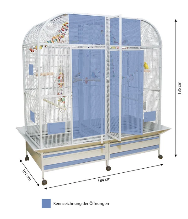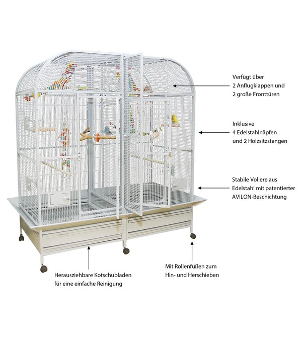 Mit dieser schönen Voliere können Sie Ihren Exoten, Kanarien oder Sittichen viel Platz im Vogelkäfig bieten. Der geräumige Käfig für Vögel besteht aus schwermetallfreiem Stahl, überzogen mit einer Avilon Pulverbeschichtung, welche speziell für die Vogel- & Nagerhaltung ausgelegt ist, die Innenhöhe beträgt 165 cm. Die kleinmaschige Verdrahtung mit einem Gitterabstand von 10 mm und einer Gitterstärke 3 mm ist vor allem für Sittiche und Papageien gut. Der Vogelkäfig verfügt zudem über eine Auffangschürze, stabile Rollenfüße und ein entfernbares Kotgitter. Er wird außerdem mit vier Edelstahlnäpfen sowie zwei Holzsitzstangen geliefert. Damit sind Sie mit den wichtigsten Utensilien für Vögel ausgerüstet. Außerdem besonders schön: Der Vogelkäfig hat im oberen Bereich zwei Anflugklappen, die Sie je nach Bedarf öffnen können. Der Käfig für Vögel wird ohne Dekoration geliefert.