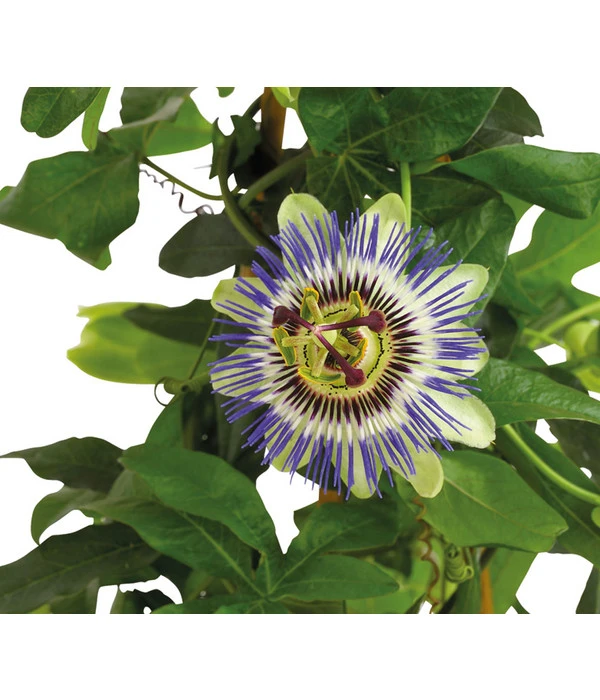 Jede einzelne der außergewöhnlichen Blüten ist ein Kunstwerk der Natur, dessen vollendete Schönheit jeden Betrachter verzaubert. Selbstbewusst recken sich die prächtigen Einzelblüten auf ihren langen Stielen aus dem grünen Laub – ein Anblick, der schon so manchen Hobby-Gärtner zum leidenschaftlichen Passionsblumen-Liebhaber gemacht hat. Doch nicht nur die Blüten sind mehr als einen Blick wert. Auch die kletternde Kübelpflanze selbst, die sich hier in attraktiver Pyramidenform präsentiert, ist ein Schmuckstück für sie sommerliche Terrasse oder den Balkon. Oder liegt bei Ihnen der Eingangsbereich des Hauses Richtung Süden? Dann können Sie mit der extravaganten Passionsblume allen Besuchern schon an der Haustür ein stilvolles Entrée bieten. Die wuchs- und blühfreudige Kletterpflanze liebt nämlich warme und sonnige Standorte. Wird dieser Wunsch erfüllt und sie regelmäßig gegossen, wird sie sich von Juni bis Oktober mit den prächtigen Blüten schmücken.
