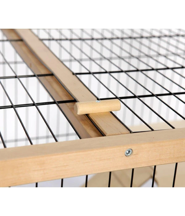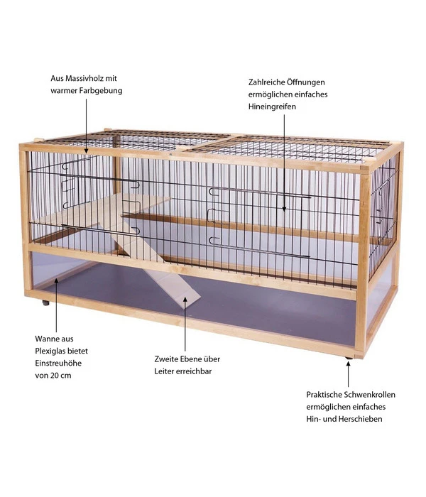 Das Massivholz mit warmer Farbgebung des Nagerkäfigs Hoppelgarden 120 von Skyline fügt sich optimal in Ihr Zuhause ein, sodass der Käfig selbst zu einem echten Blickfang wird. Mithilfe der praktischen Schwenkrollen lässt sich das Nagerheim zudem sehr leicht bewegen. Das hilft Ihnen jedes Mal, wenn Sie die Behausung für Ihre Schützlinge säubern wollen oder einen Standortwechsel vornehmen. Überraschen Sie Ihre Lieblinge mit dem gemütlichen Nagerkäfig Hoppelgarden 120 der Firma Skyline und bestellen Sie den Käfig jetzt gleich!