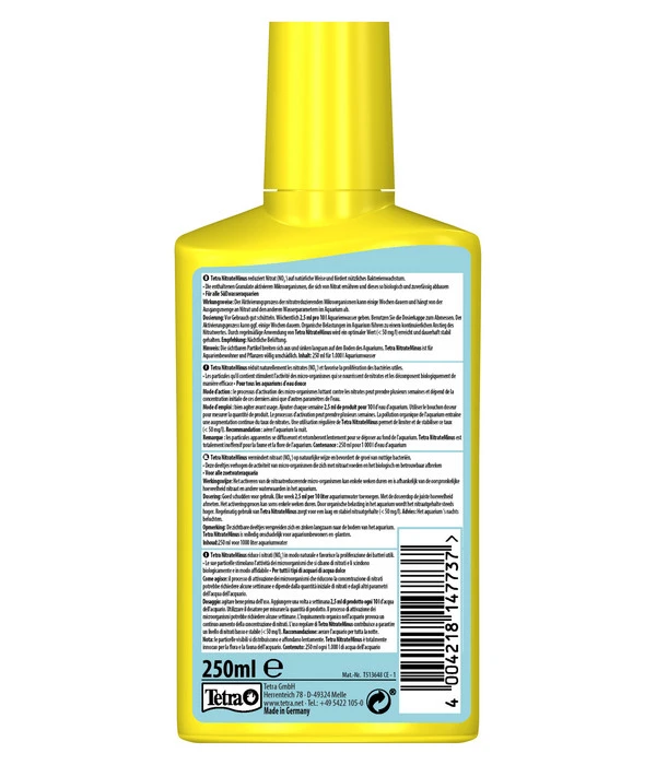 Vor Gebrauch gut schütteln. Wöchentlich 2,5 ml auf 10 l Aquarienwasser geben. Das sichtbare Wirkstoffgranulat verteilt sich im Aquarium und sinkt langsam zu Boden. Tetra NitrateMinus ist für die Aquarienbewohner und Pflanzen absolut unschädlich. Zur Überprüfung des Nitratwertes (NO3-) im Aquarium kann z. B. der Tetra Test 6in1 oder der Tetra Test NO3- benutzt werden. Bei einem zu hohen Nitratwert sollte Tetra NitrateMinus eingesetzt werden.