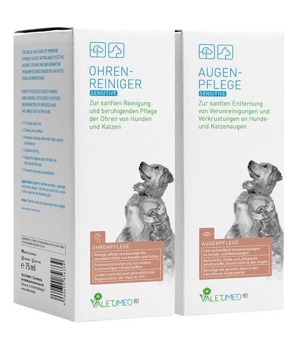 Katzen- und Hundebesitzer kennen es nur zu gut. Durch Verunreinigungen sind die empfindlichen Augenschleimhäute und Ohrenkanäle oft gereizt und der Vierbeiner versucht ergebnislos, durch Schütteln und Kratzen das unangenehme Gefühl loszuwerden. Glücklicherweise können sie als Halter mit dem VALETUMED Pflegeset Ohrenreiniger Sensitive & Augenpflege Sensitive gezielt helfen. Egal ob zur akuten Anwendung oder vorbeugend, VALETUMED lindert zuverlässig Juckreiz in Augen und Ohren bei Katzen und Hunden.