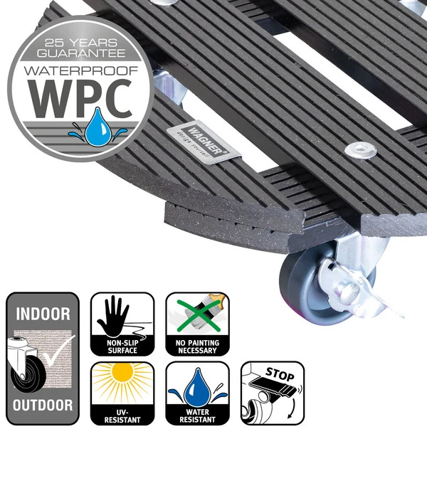 Egal, ob Sie sich das Umräumen großer Pflanzen oder das Wegschieben von Wohnaccessoires zum Saubermachen erleichtern wollen, der Wagner Pflanzenroller hilft Ihnen. Beim Einsatz im Außenbereich können Sie die Staunässe bei Ihren Pflanzkübeln auf der Terrasse verhindern und jederzeit Ihre bepflanzten Behälter mit dem Roller verschieben. Seine Standfläche aus Holz-Kunststoff-Gemisch verrottet nicht, ist splitterfrei und verhindert durch die strukturierte Oberseite das Verrutschen Ihrer Pflanzen. Lassen Sie sich überzeugen – für mehr Beweglichkeit drinnen und draußen.