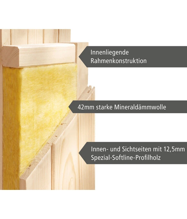 Die Wolff Finnhaus Innensauna de luxe Xena hat vorgefertigte Wände, die aus einer stabilen Rahmenkonstruktion bestehen, bei der sich zwischen zwei Softline-Profilhölzern aus Nordischer Fichte eine Schicht aus 42 mm Mineraldämmwolle befindet. Da auch die vormontierte Decke mit Mineralwolle gedämmt ist, wird die Hitze perfekt in der Saunakabine gehalten. Die Saunabänke sind aus massivem Espenholz, das gut zu reinigen ist und außerdem nicht unangenehm heiß wird. Ein Dachkranz mit dem LED-Strahlerset aus 3 frei positionierbaren 7,5 Watt-Strahlern macht die luxuriöse Ausstattung perfekt.