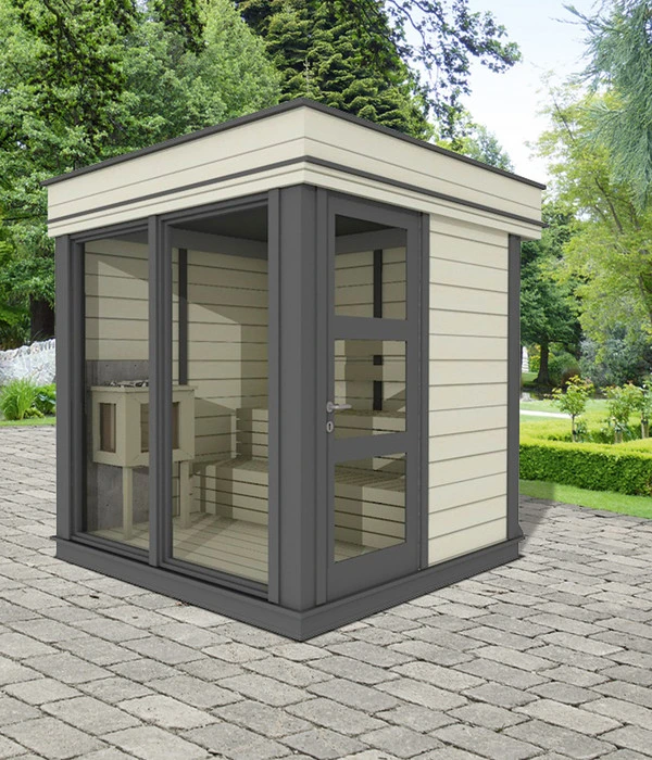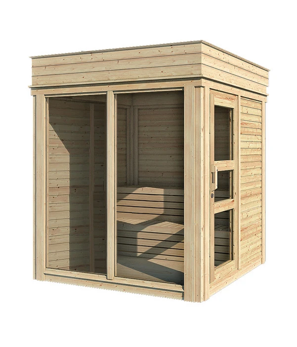 Ihr Garten soll sich in eine Wellness-Oase verwandeln und dabei spielt ein spezielles Highlight die Hauptrolle: die Finnhaus Sauna Paradiso 1-Raum. Eine hervorragende Wahl, bei der Ihnen nicht nur traumhaftes Saunavergnügen winkt, sondern auch ein modernes Holzbauwerk Ihren Garten bereichern wird, das mit seinen gekonnt kombinierten Design-Elementen begeistert. Der kubische Bau aus naturbelassenem, nordischem Fichtenholz ist an Ausstrahlung kaum zu übertreffen. Wozu auch die edlen Glaselemente und die Holzwand in trendstarker Sprossenoptik beitragen. Sie verleihen der Außensauna die luftig leichte und gleichzeitig äußerst edle Optik. Beim Saunieren zeigen die Glaselemente dann, was sie zu Ihrem Wellness-Erlebnis beitragen können. Denn durch sie gelangt Tageslicht nach innen und schafft in Kombination mit den naturbelassenen Holzwänden die typische Saunaatmosphäre. Ihnen wiederum gewähren sie den Blick hinaus in Ihre grüne Oase. Und auch deshalb ist es so unendlich entspannend in Ihrer Finnhaus Sauna Paradiso 1-Raum zu schwitzen!