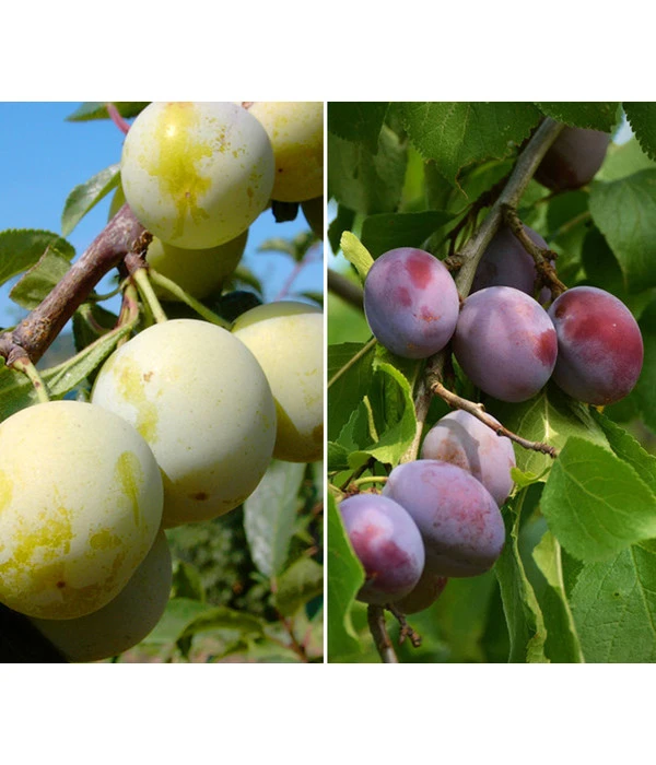 Wow! Dieses Frucht-Duo zieht alle Blicke auf sich. Eine Mischung aus gelben Mirabellen und violetten Zwetschgen zeigt sich an dem stark wachsenden Fruchtbaum. Dieser Farbkontrast lässt den Baum zwischen August und September strahlen. Denn dann sind die Früchte reif und können geerntet werden. Die Mirabellen ‚von Nancy‘ leuchten wie kleine gelbe Sonnen, sind süß, fruchtig und besitzen ein festes Fruchtfleisch. Schönberger-Zwetschgen werden auch ‚Große Hauszwetschgen‘ genannt, sie besitzen eine lila-rote Farbe und bringen reiche Erträge. Das Fruchtfleisch ist goldgelb, aromatisch und sehr saftig. Es lässt sich außerdem gut vom Stein lösen. Beide Sorten sind Selbsbefruchter, weswegen Sie keinen zweiten Obstbaum benötigen. Was gibt es Besseres als einen Obstbaum mit zwei unterschiedlichen Sorten an Früchten auf einmal. Ihre ganze Familie wird die leckeren Früchte lieben.